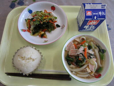 牛乳 煮込みうどん 海藻サラダ チーズ蒸しパン