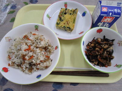 牛乳 いなり寿司風混ぜご飯 ほうれん草入り玉子焼き ひじきの炒め煮