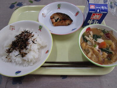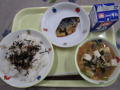 牛乳 ご飯 ひじきのふりかけ サバのピリ辛焼き さつま汁