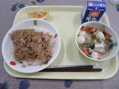 牛乳 麦ごはん 豚丼(具) 白玉スープ こなつ