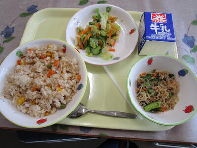 牛乳 コーンピラフ フレンチサラダ 白滝のソテー