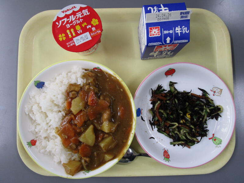 牛乳・麦ごはん・チキンカレー・ひじきのマリネ・ヨーグルト