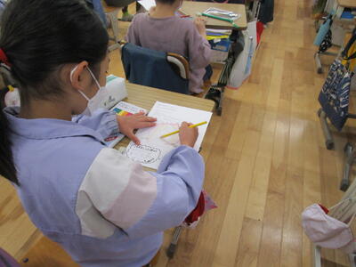 1年生、国語でひらがなを練習しています。鉛筆をゆっくり動かして、とても丁寧に書いていました。