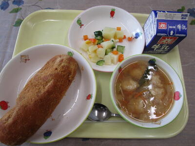 牛乳 きなこ揚げパン 豆腐団子スープ マセドアンサラダ