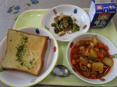 運動会の練習が本格的になる時期です。活発に運動するとエネルギーの消費量が増えて、いろいろな栄養素が必要になります。自分に適切な量を食べることと、バランスの良い内容で食べることの2つが大切です。量と内容のどちらかが欠けても、疲れがたまり、集中力がなくなるだけではなく、ケガにもつながります。食事をとることは自分の健康を守ることです。しっかり食べて、ぜひ力を発揮してください。今日の主菜のポテトオムレツにはベーコンやハムのほかに野菜も入っています。