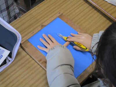4年生、彫刻刀を使って、色版画を作る予定です。どの子も集中して取り組んでいました。