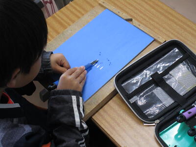 5年生、理科室で、自分たちの作った電磁石が電流を流すと磁石になっているかどうか確かめていました。コイルをまいて電磁石をつくるのが大変だったらしく、ちゃんと磁石になっているのを確かめられると、とても嬉しそうでした。