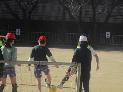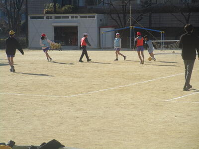2年生と6年生が校庭で体育をしていました。寒い中でも、タグ取り遊びをしたり、サッカーをしたり、元気に走り回っていました。