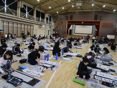 5年生、6年生、体育館で学年合同で、書初めをしていました。外部講師の先生が。全体指導の後に、個別に児童に指導をしていました。