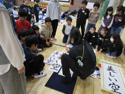3年生、4年生、書初めを体育館で行いました。どちらの学年のときも、講師の先生の話を聞きたい子供たちが周りを取り囲んで話を聞いていました。