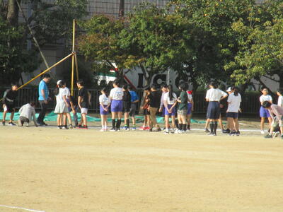 校庭では、秋晴れの中、2年生全クラスがボール運動、3年生の1クラスが鉄棒運動、縄跳びをやっていました。