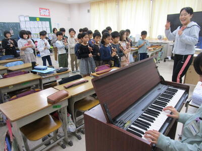 6年生、市内音楽会で歌う曲を児童の伴奏で練習していました。前回見た時より、声が少しずつ出るようになってきました。
