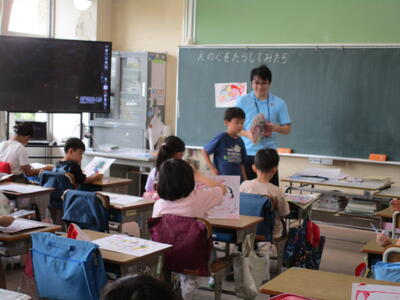 1年生、図工「ひかりの くにの なかまたち」の学習です。使う材料や、材料の使い方を実物や画像を使って先生が話していました。子供たちは、話を聞いて、「おさかなつくりたいな」「くまにしようかな」などとつぶやき、作るものの想像を膨らませていました。