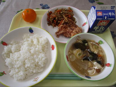 牛乳 麦ごはん 和風あんかけ擬製豆腐 ツナと野菜の胡麻和え じゃがいもと玉ねぎの味噌汁 みかん
