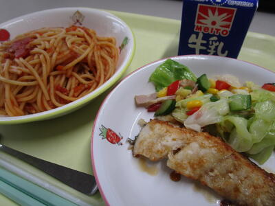 きのこスパゲティ 豆腐のオイスター炒め さつまいものセサミバター焼き 牛乳
