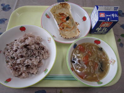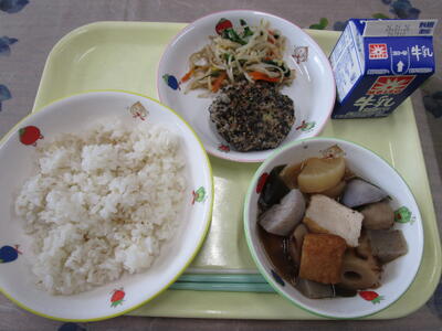 今日、1月15日は小正月です。昔の暦では正月は1月15日にあたりました。そこで元旦を「大正月」1月15日を「小正月」とよび、昔ながらの行事を行ってきました。大正月が年神様を迎える行事なのに対し、小正月は農業にまつわる行事を行います。餅花(まゆ玉)を作って紅白の餅を柳の枝につけて飾り、豊作を祈ります。地上によってはどんど焼きと言って正月飾りや書初めを燃やす行事もあります。その煙の乗って年神様が天にかえっていくとされています。また小正月には、小豆を入れた粥を食べます。災いがふりかからず、健康に過ごせますようにと祈ります。給食ではおかゆを作るのが難しいため、赤飯にしました。