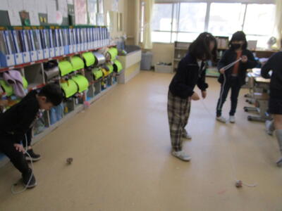 5年生、理科室で、自分たちの作った電磁石が電流を流すと磁石になっているかどうか確かめていました。コイルをまいて電磁石をつくるのが大変だったらしく、ちゃんと磁石になっているのを確かめられると、とても嬉しそうでした。