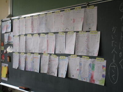 4年生、国語「クラス図鑑をつくろう」で、「黒板がなぜ緑なのか」「空はなぜ青いのか」など疑問に思ったことを調べて、文章にまとめていました。読んでいる人に伝わるように、写真や図を使って工夫をしていました。