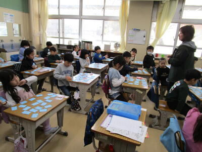 1年生、教室で五色百人一首の水色の札を机の上に並べています。先生が取り方を説明し、句を読んで、自分の札をとる練習をしていました。