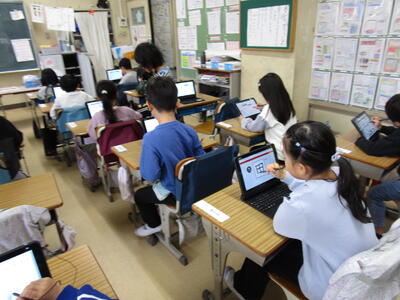 3年生、体育のマットの学習で前転や後転を練習していました。先生から、「手をつくときは、パーでしっかりとマットを押しましょう」と助言を受けていました。自分の動きを録画して確認するため、タブレットを皆持参していました。