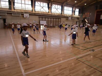 1年生、体育館で2クラス合同で、体ほぐし運動や縄跳びをやっていました。「1分で85回も前跳びできたよ」「駆け足跳びやあや跳びもできるよ」など、子供たちはできるようになったことを教えてくれました。体ほぐし運動では、軽くジャンプをしながら、先生の笛の合図で、先生と同じように動きます。体を反転させたり、しゃがんだり、大きくジャンプしたり、とても、楽しそうに動きをまねていました。