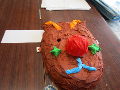 2年生、和紙やカプセルを土台に張り付けてお面づくりをしました。今日は、お面にひもを通すことが、とても大変そうでした。
