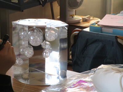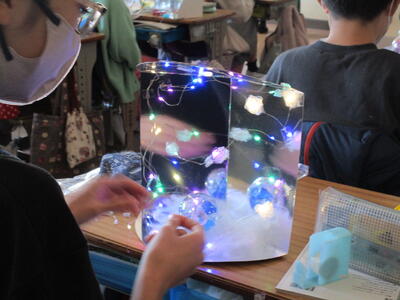 6年生、図工「きらめき劇場」で、きらきら光るボールや水を入れたペットボトルなどを、工夫して使っていました。