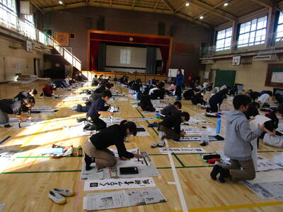5年生、6年生が体育館で地域講師の先生の指導の下、書初練習をしました。5年生は「世界の国」6年生は「伝統を守る」です。高学年になればなるほど、文字そのものも難しくなりますが、文字数が増えバランスよくおさめるのも難しそうです。