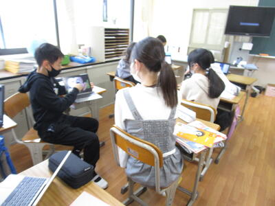 5年生、パソコンルームで古典について、自分の好きなテーマで調べ学習をしてまとめています。竹取物語や平家物語など、先生の作った見本を見ながら、わかりやすくまとめていました。