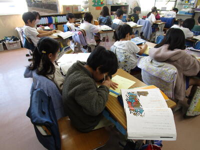 2年生、教室や図工室で町探検の発表の練習をしてから、1年生の教室で発表しました。劇をしたり、ペープサートを使ったりして、発見したことをわかりやすく1年生に伝えていました。