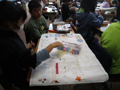 4年生、社会科で千葉県や市川のお祭りや建造物のことを調べて、班ごとに新聞にまとめました。班ごとに新聞のおおまかな内容や調べた感想を発表し、廊下に掲示します。
