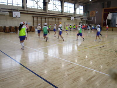2年生、体育館で体育の授業が始まると、先生が準備をしていても体育係さんが中心となり掛け声をかけて準備運動を始めていました。別のクラスでは、今週の金曜日に行われる「1年生を迎える会」の練習をしていました。