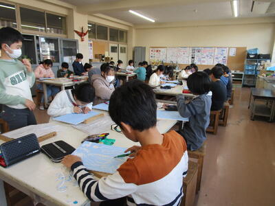 4年生、音楽会の招待状を作っていました。カードを開くと飛び出すしくみを使ったり、音符やピアノを描いたり、様々な工夫がみられました。