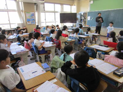 4年生、外国語指導員の先生が、今年度、初めての授業でした。英語で、自己紹介や挨拶をしたり、世界の国々を言ったりしていました。発音をまねながら、繰り返し、口に出して言うことが、英語になじむ秘訣ですね。