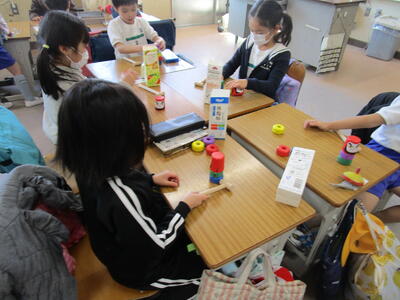 2年生、国語の「おもちゃ大会をしよう」で糸電話や段ボール砲、割りばしでっぽうなど手作りのおもちゃ作りをしていました。