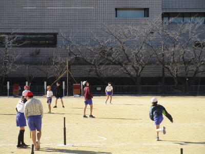6年生、1校時、校庭で体育のティーボールをやっていました。今日は日が差していて暖かく、半袖の児童が多かったです。