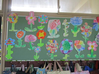 1年生、廊下にありがとうの花が掲示されていました。とてもカラフルだったり、にこにこと笑っていたり、見ているこちらも元気になります。