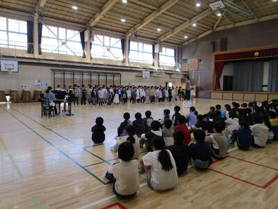 3年生、体育館で音楽会の入退場の練習をしていました。初めの言葉の後に、タンギングに気を付けて、2曲リコーダーの演奏をしました。その後、「ビリーブ」を歌いました。途中手話をいれているところもあり、歌声が体育館中に響いていました。
