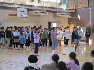 1年生、体育館で音楽会の練習をしていました。今日は、自分の席から舞台に立つまでの入場や退場の仕方、春夏秋冬の歌を歌う時の場所の移動やセリフの練習をしていました。場所の移動もスムースでセリフも上手でした。