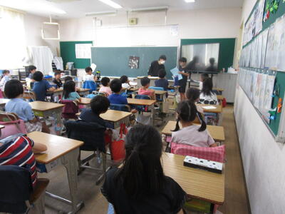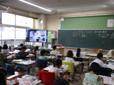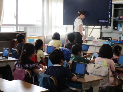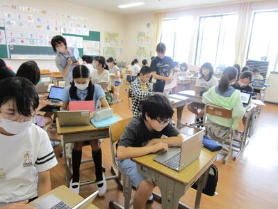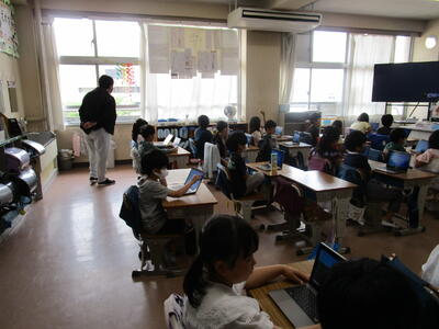 2年生、端末を使用するときの約束をいくつか確認しながら、実際に端末を操作していました。ICT支援員の方も教室で子供たちの活動を支援していました。