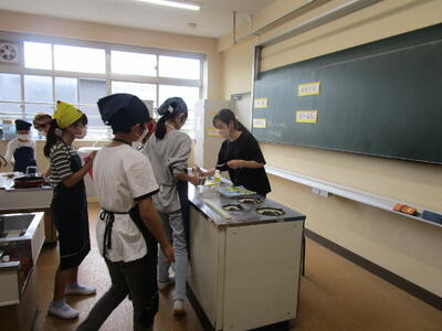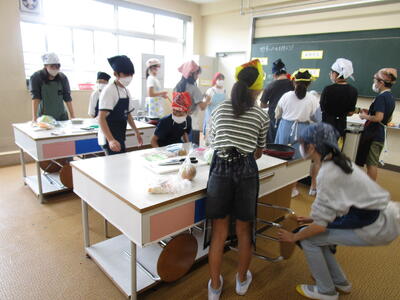 向かいの家庭科室では、同じく6年生が、調理実習を開始したところです。「野菜炒め」を作るようで、キャベツやもやし、ピーマンなどの野菜を調理机に並べ、身支度を整えて、とても楽しそうに活動していました。