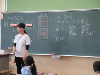 1年生のクラス、算数「たし算」の学習をしています。たし算にするときの、言葉(あわせる、ぜんぶで、みんなで・・・)を確認して、ブロックでたし算をして数を確かめました。式(5+3=8)をノートに書きました。