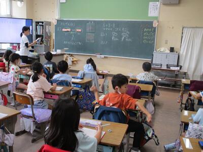 1年生、「2+3」や「5+3」などの足し算のカードをもって、二人一組になり、友達同士で問題を出して、答える学習に取り組んでいました。
