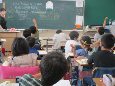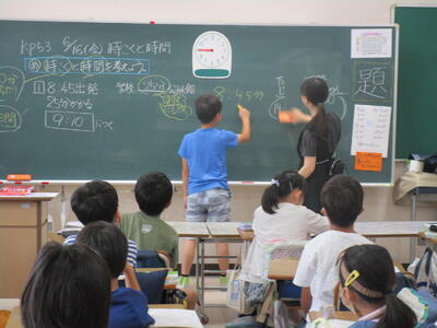 3年生、算数「時刻と時間」の学習です。「8時45分に学校出発して、25分後に公民館につきました。公民館についたのは、何時何分でしょう」という問題について、やり方を確認しています。いろいろなやり方、考え方について、子どもが前に出て説明をしていました。