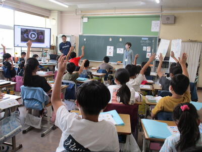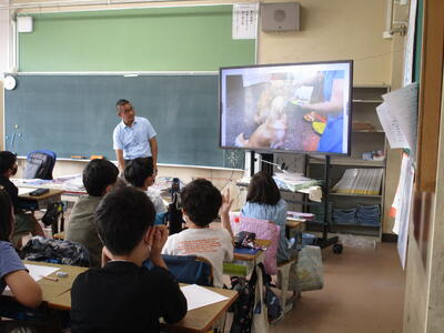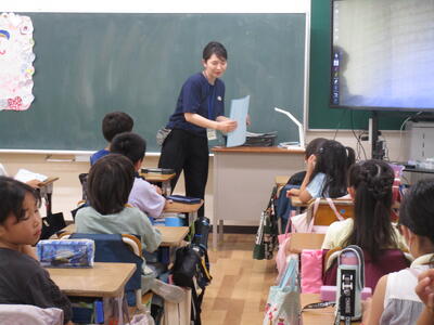 4年生、「多文化共生出前授業」で、ゲストティーチャーを招き、様々な国のことを学びました。ゲストティーチャーとしてペルー、ネパール、台湾の方が一人ずつ各クラスに入り、授業を進めました。自分の国の場所や気温を伝えることから始まって、現地の学校のスケジュールやその国で行われている独特の行事の紹介もありました。ネパールに「犬の日」があることを知り、子どもたちも驚き、話を熱心に聞いていました。