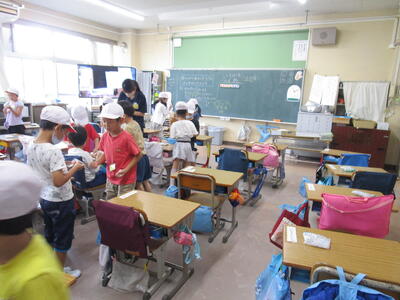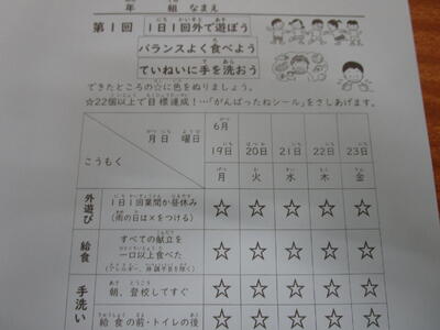全校の取り組みで、ヘルシーチェックカードを5日間、記録します。朝、委員会の児童が各クラスに説明をして、カードを配付しています。その後、担任から付けたしの説明があり、早速、今日の分をチェックしている児童もいました。