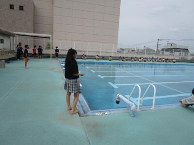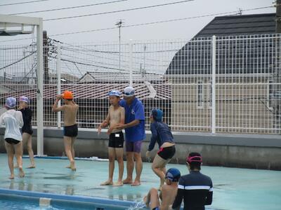 4年生、1.2校時の水泳学習は、気温が低くて入れませんでしたが、5.6校時に変更して、水泳学習をすることができました。地域のサポートの方2名も指導に入っていました。手のかき方など、具体的にアドバイスをしてくれていました。とても心強いですね。