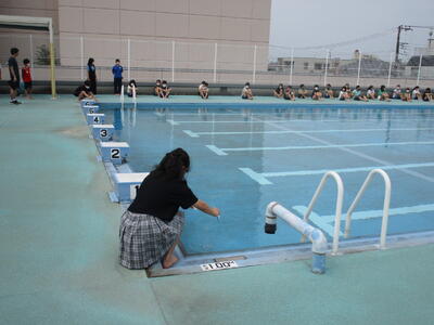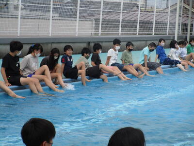 6年生「プール開き」がありました。今日は、プール開きのみで、水着に着替えての入水はしませんでした。体育委員の児童の進行で、プールで事故が起こらないように安全を願って、代表児童がお清めの塩と酒をプールの4隅からまきました。プール開きが終わった後に、子どもたちは足をプールの水につけていました。