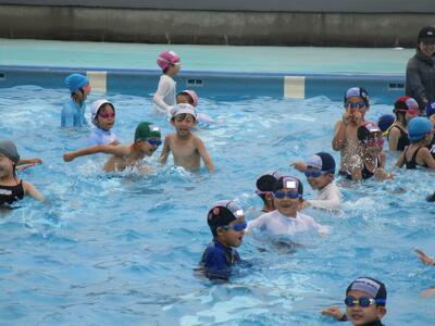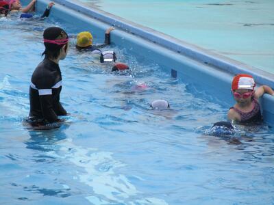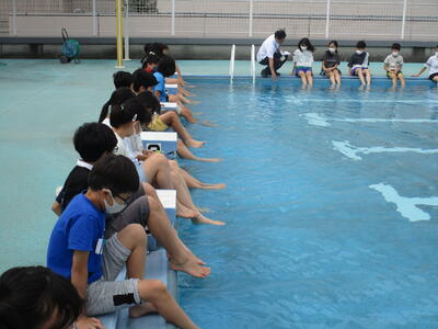 1年生、学校で初めてのプールでした。今日は水慣れで、水に潜ってじゃんけんしたり、ジャンプや速足でプールを横切ったりしました。地域の方3名のお手伝いがあり、学校職員も3名補助で入り、担任をいれると11名で子供たちを指導し、安全を見守りました。子供たちは、プールからプールサイドに上がるが大変そうでしたが、とても楽しそうに活動していました。