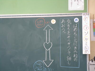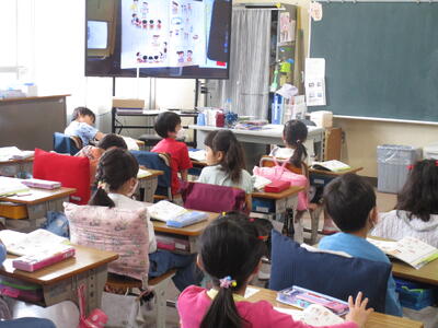 1年生、国語「みんなにはなそう」の授業で、今日のめあては「みんなにはなすことをきめよう」でした。担任が見本で描いた「オムライス」の絵をもって3~5文程度の話をしました。子どもたちは興味津々話を聞いていました。担任の先生は「好きな食べ物」をテーマに話をしました。子どもたちも「好きな〇〇」を考え、絵をかいて話をする気持ち満々になっていました。担任の見本があると、子どもたちも自分の発表のイメージをもちやすいですね。